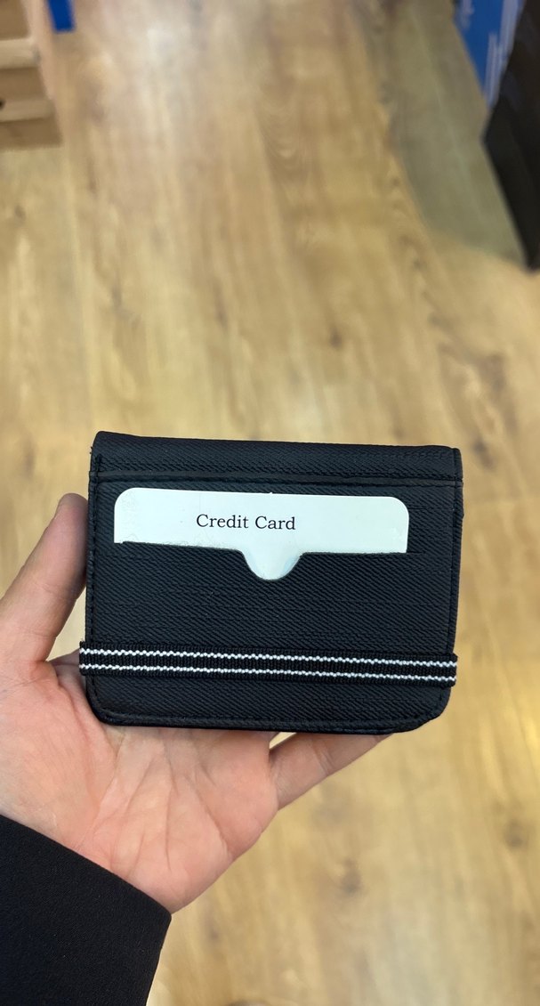 Siyah renkli, baskılı desene sahip kartlık. Sentetik kumaştan üretilmiş, velcro kapamalı ve kredi kartı için bölmesi vardır.