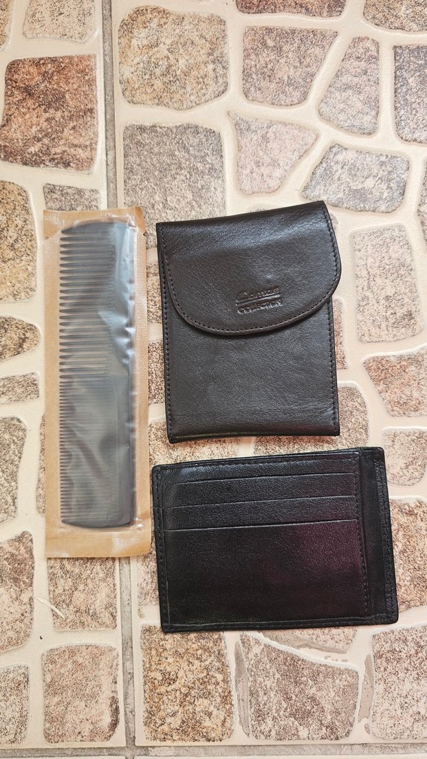 Kahverengi erkek cüzdanı ve siyah kartlık ile birlikte siyah tarak içeren sade tasarımlı set.