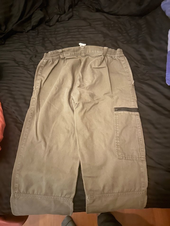 haki renkli keten kumaştan üretilmiş, bol kesim ve kemerli pantolonu. Normal midi boyda, desensiz ve günlük rahat kullanım için uygundur.