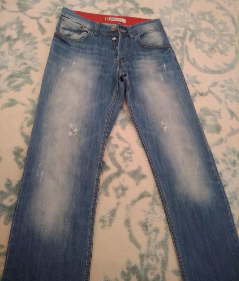 Düğmeli, mavi tonlarda bağlama desenli, bol kesim erkek denim pantolon. Sokak stili ve günlük kullanım için uygundur.