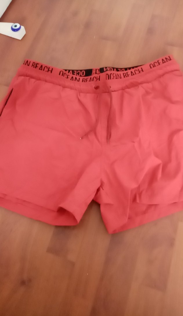 'OCEAN BEACH' baskılı elastik bel bantlı, rahat kesim erkek deniz şortu.