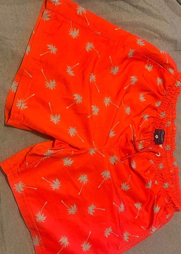 Çok iyi durumda, önde iki cep, arkada bir cebi olan palmiye desenli deniz şortu