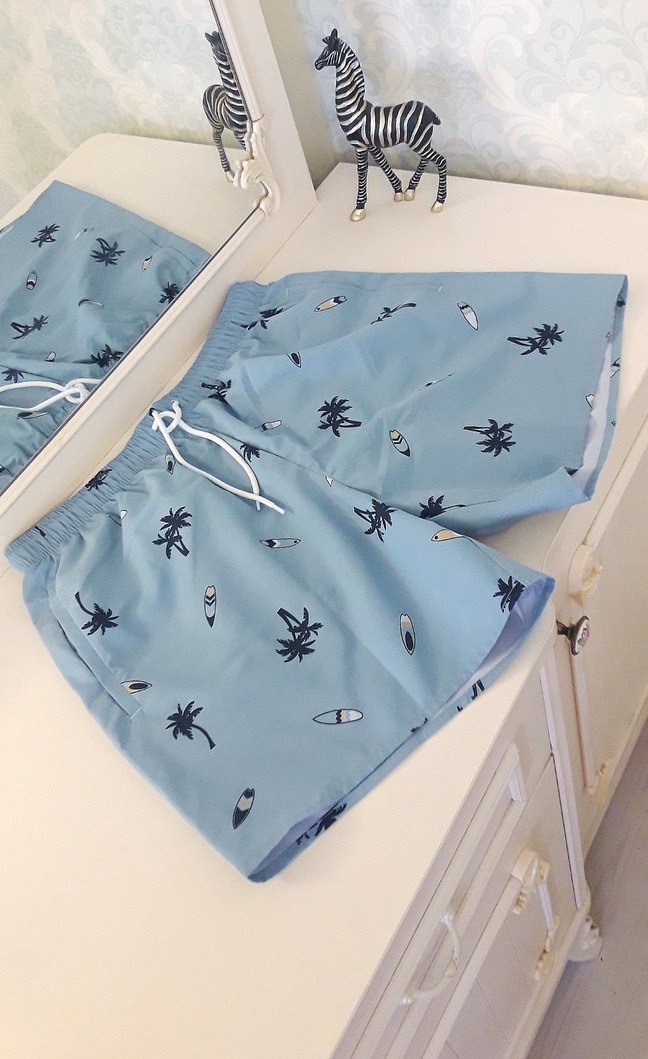 Pastel mavi renkli, palmiye ve sörf baskılı, bol kesim erkek deniz şortu. Plaj ve rahat sokak stili için uygun. Yan cepleri mevcut Aynı gün hızlı kargo yapılır