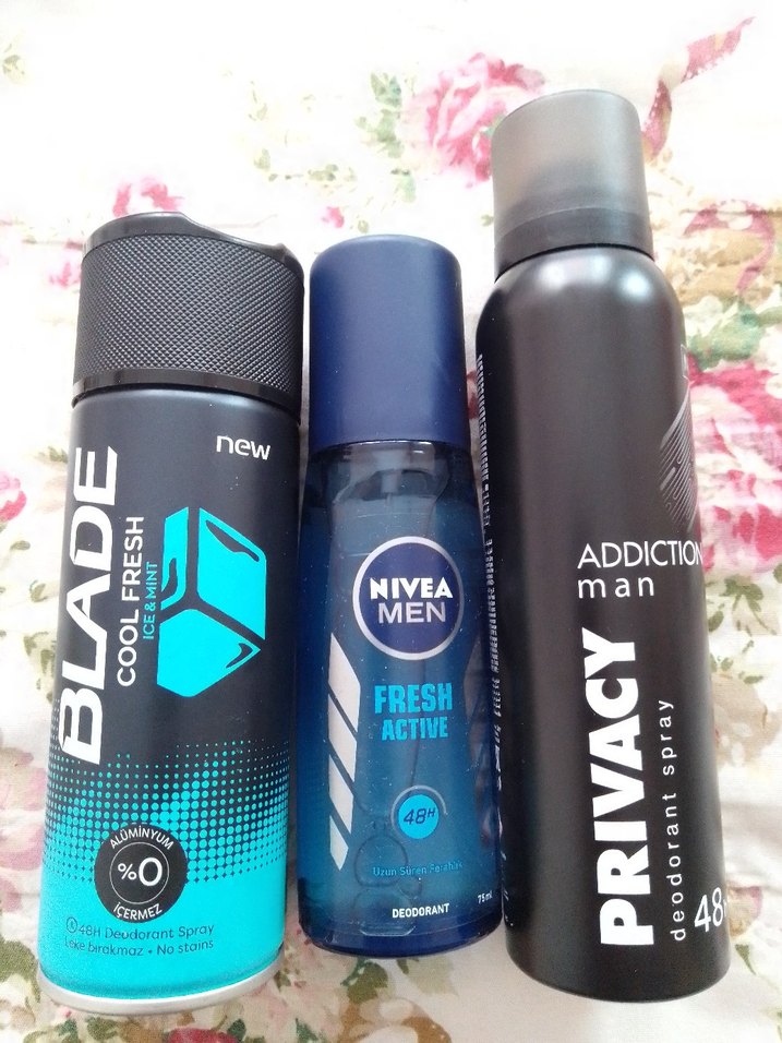 Blade Cool Fresh, Nivea Men Fresh Active ve Privacy Addiction erkek deodorantları içeren set. Uzun süre ferahlık ve koku koruması sağlar.