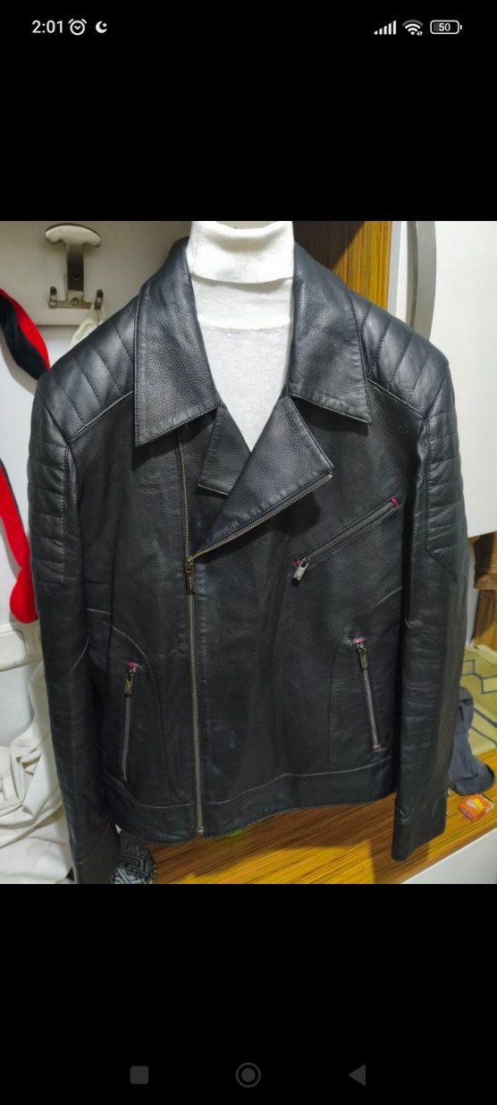Erkekler için siyah deri biker ceket, kesik yakalı, uzun kollu ve fermuarlı ceplidir. Regular fit ve normal boydadır, günlük sokak stiline uygundur.