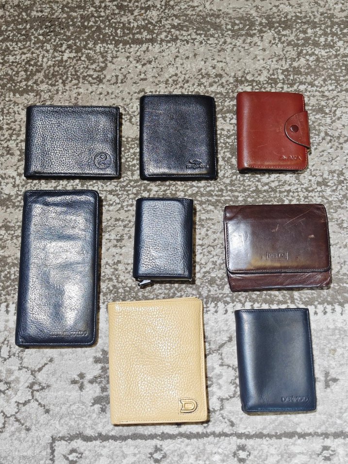 Koyu ve kahverengi tonlarda, farklı boyut ve tarzlarda erkek deri cüzdanlar. İş hayatına uygun modeller.