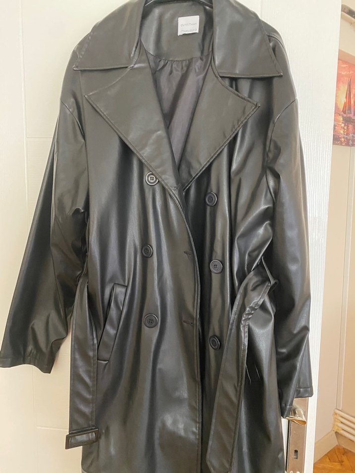 Siyah deri, düğmeli, notched lapel yaka ve strappy kollara sahip, rahat kesim trençkot.Ofis ve günlük kullanıma uygundur.