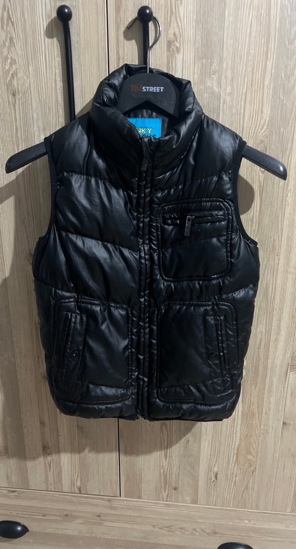 Siyah, deri erkek yelek, kolsuz ve kemerli. Yüksek yakalı, dar kesim, çok cepli ve düz yüzeyli.