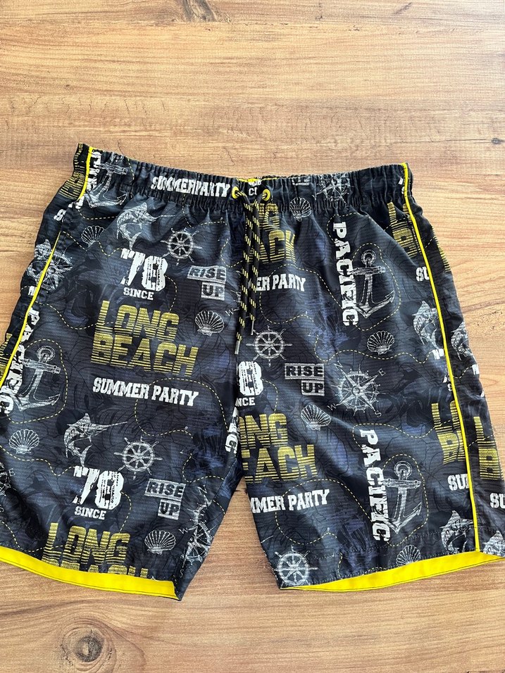 Koyu sarı renkli, kısa kollu, üzeri yazılı ve deniz temalı desenlerle bezenmiş erkek deniz şortu. Elastik bel bandı ile rahat kullanım sağlar.