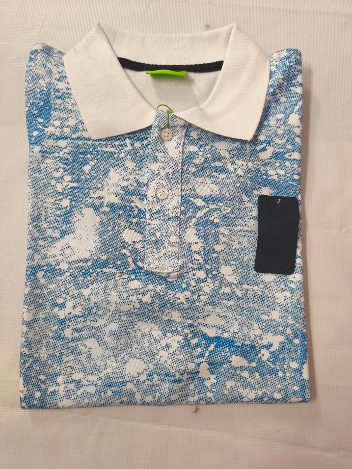 Erkekler için beyaz yakalı, mavi-gri desenli kısa kollu polo tişört. Sentetik kumaştan, düğmeli ve rahat kesimlidir, günlük dış mekan kullanımı için uygundur. ️