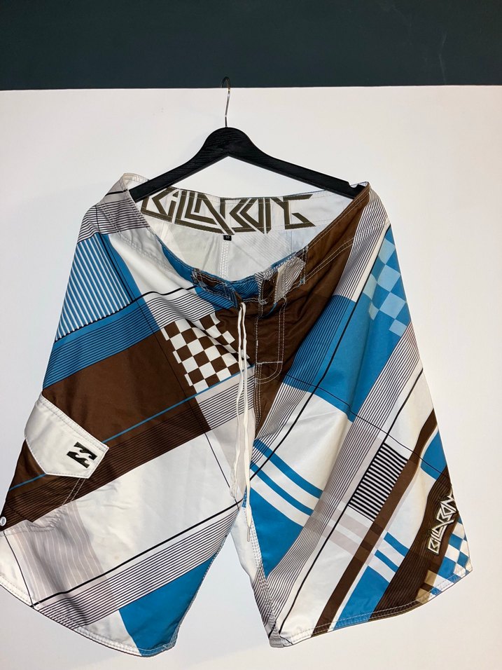 Erkekler için bol kesim, koyu mavi ve kahverengi geometrik desenli mini şort. Kemerli detaylı, plaj için uygun.