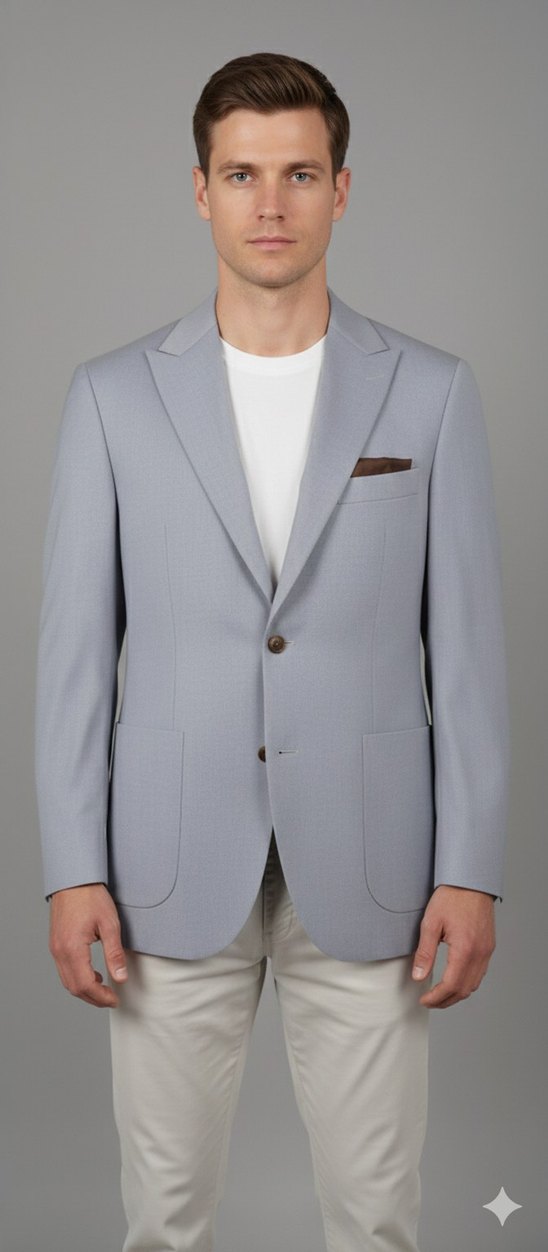 buz mavisi renk, düğmeli ve uzun kollu erkek ceket. Ofis için uygun, klasik ve çağdaş tarzı bir arada sunar. Düz ve normal boyda. koltuk altı 48 cm boy 73 cm