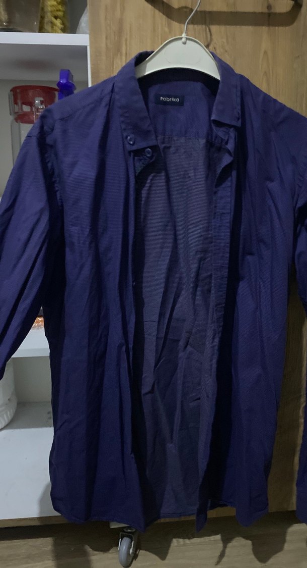 Düğmeli, notched lapel yakalı, sentetik kumaştan yapılmış koyu mavi renkli erkek gömleği. Uzun kollu ve normal kesim, günlük rahat kullanım için uygundur.