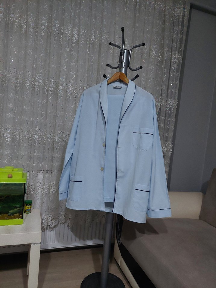 Erkek pijama takımı, düğmeli ve uzun kollu, normal kesim, gri-mavi renkte, minimal ve trend rahat stil için uygundur. Sandık ürünüdür Hiç kullanılmadı Uzun zamandır saklıyorum Bir deformesi yoktur Alt üst takım halindedir Dönem ürünüdür Açıklamayı dikkatli okuyup alım yapınız İade kabul etmiyorum