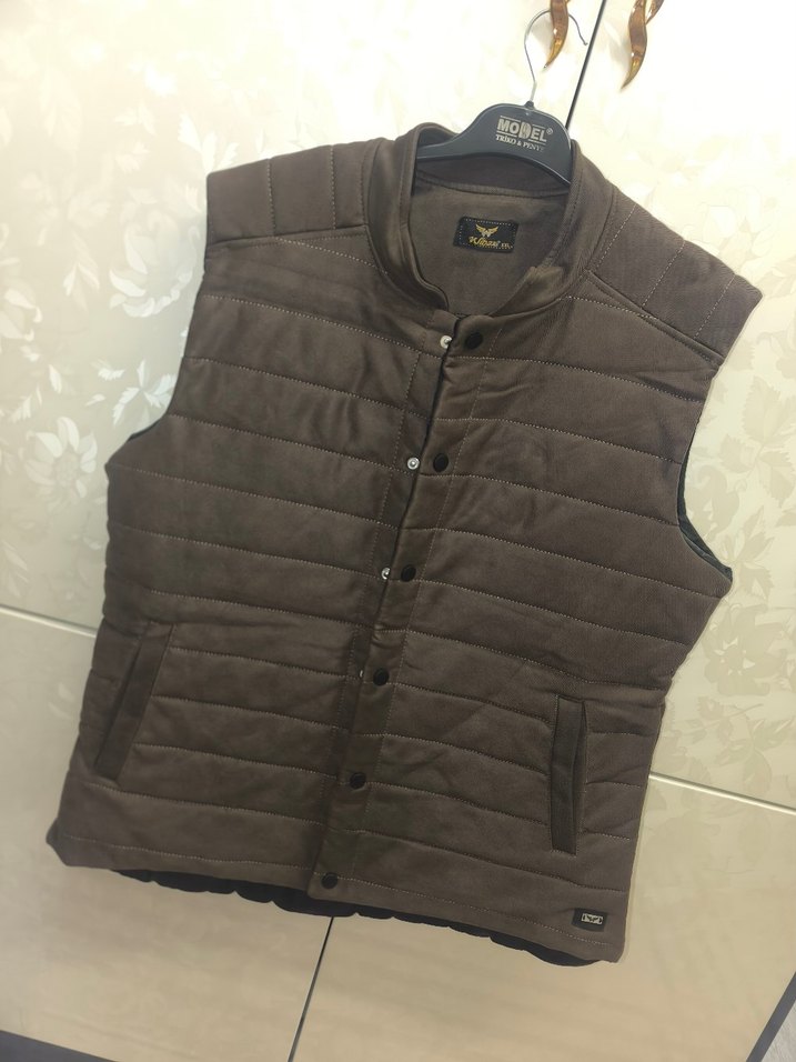 Düğmeli, yüksek yakalı kahverengi süet yelek, günlük sokak stili için rahat normal kesim sunar. xl.xxl uyumlu fit tarz ceket l.xl. XXL uyumlu temiz skntisiz