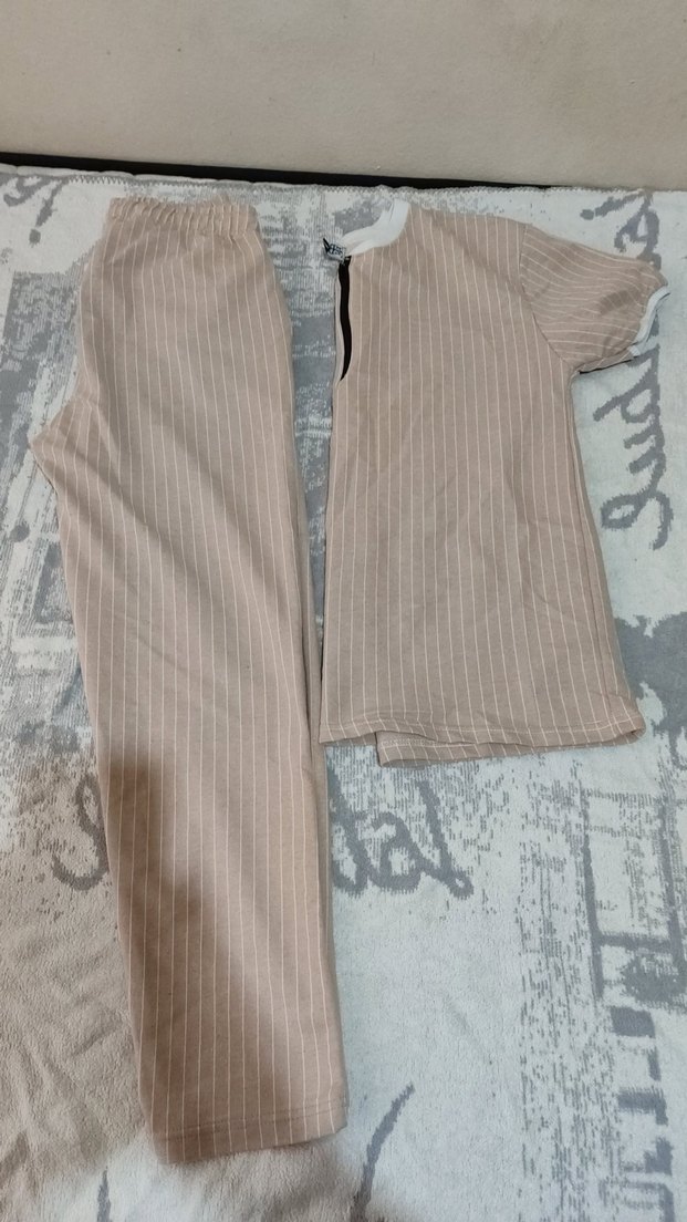 Erkek pijama takımı, normal boy pantolon ve kısa kollu üstten oluşur. Bej renkte ince çizgili, V yakalı ve düğmeli detaylıdır. Rahat ve günlük kullanıma uygundur.