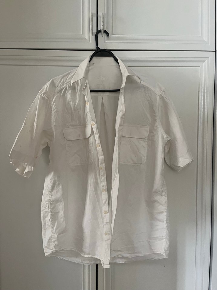 Düğmeli, cep detaylı, kısa kollu beyaz keten gömlek. Normal boyda ve bol kesim, günlük kullanıma uygundur.