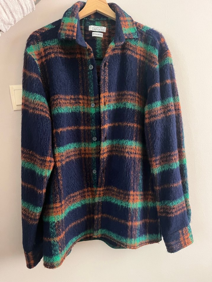 Bu erkek gömleği, bol kesim, uzun kollu ve düğmeli ön yapıya sahiptir. Yumuşak ve sıcak kumaştan üretilmiş, koyu renkli çoklu ekoseli desen ve kesik yaka ile sokak stili ve retro havası sunar. Günlük kullanıma uygundur. Ürün bedeni M bedendir.