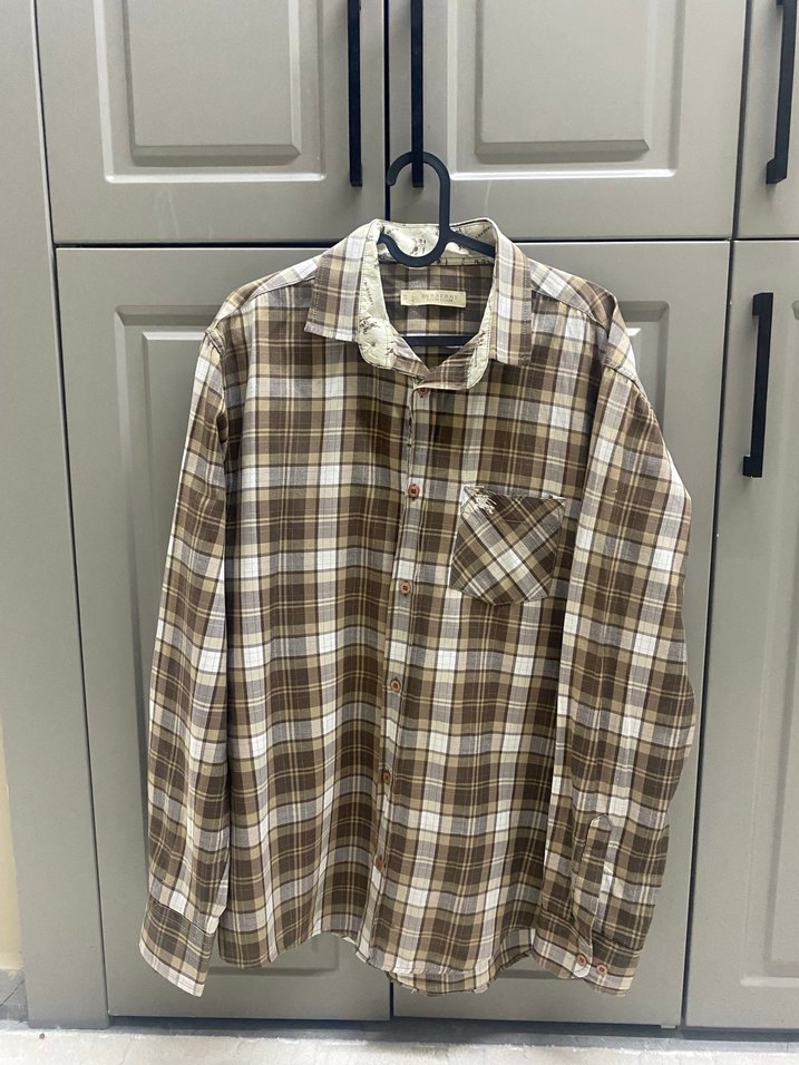 Uzun kollu, yakalı ve düğmeli erkek gömleği. Normal midi boyunda, bol kesim ve yumuşak tekstil kumaştan, kahverengi ve gri tonlarında, günlük rahat stil için uygundur.