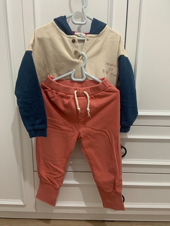 Uzun kollu,yumuşak kumaştan pastel pembe pantolon içeren bebek erkek eşofman takımı. Minik bir delik var giyince belli olmayan