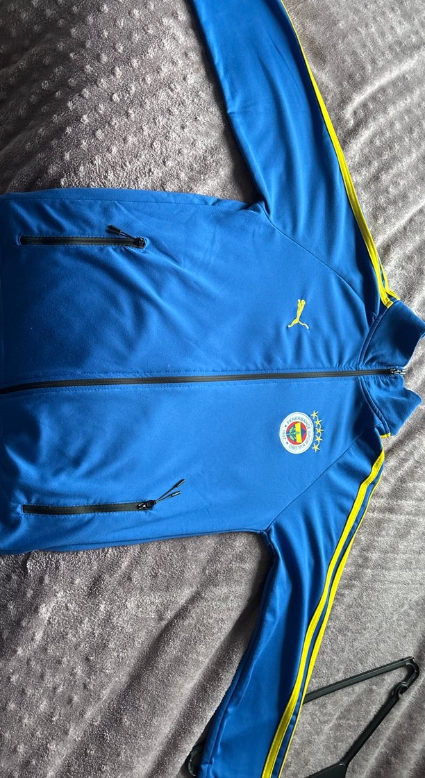 Erkekler için mavi fermuarlı sweatshirt, uzun kollu ve yuvarlak yaka. Yumuşak ve sıcak kumaştan, kol boyunca sarı şeritlerle spor ve günlük kullanıma uygun.az kullanılmıs cakmadır. S beden olup 13 yasa uygundur
