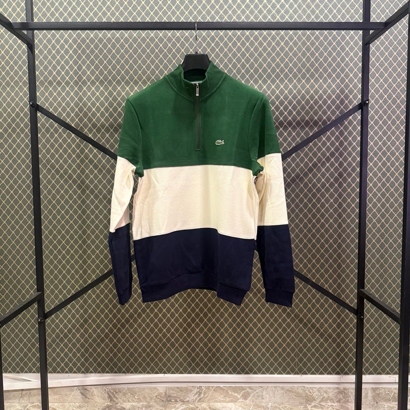 Erkekler için uzun kollu, fermuarlı boğazlı sweatshirt. Yeşil, beyaz ve lacivert renk bloklu, kısa ve regular fit kesim. Yumuşak ve sıcak kumaştan üretilmiştir.