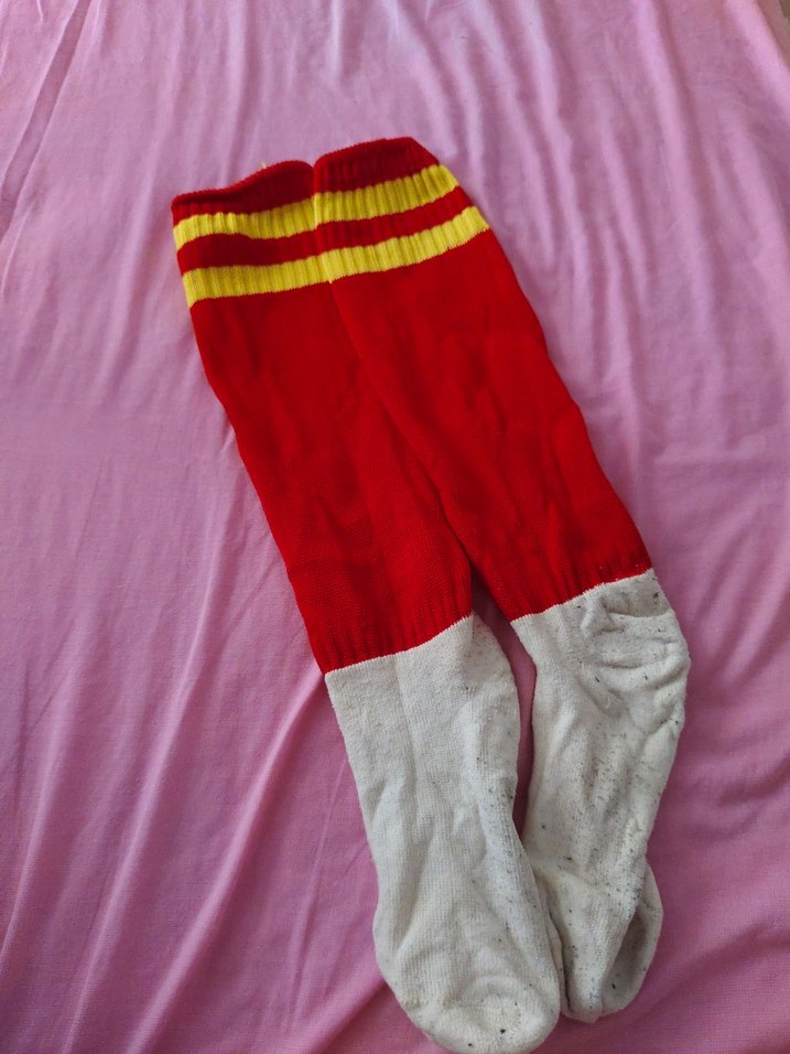 Erkek için kırmızı renkli, üst kısmında sarı çizgiler bulunan yumuşak dokulu çoraplar. Desensiz ve rahat kullanım sağlar. mavi olanı öylesine göndereceğim değerlendirme yapılabilir lastkte esneme var