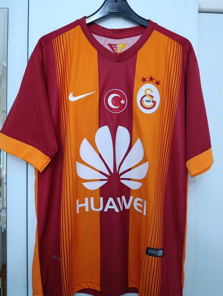 Erkekler için kısa kollu, yuvarlak yakalı, bol kesim, drapeli Galatasaray forması. Koyu turuncu ve bordo renklerde, baskılı Huawei logosu içerir. ⚽