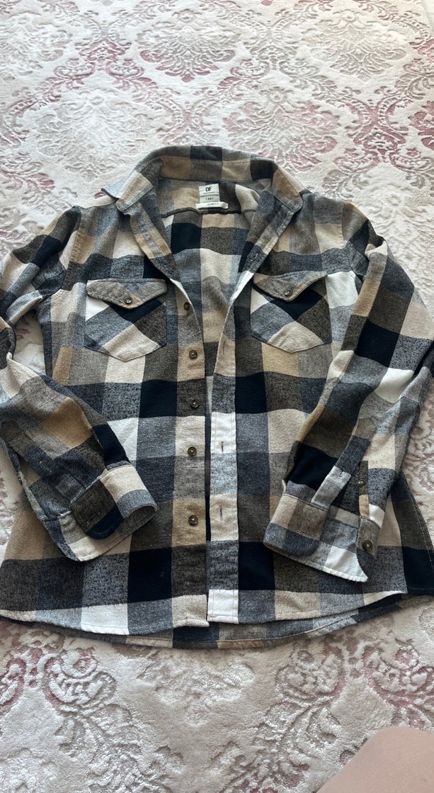 Pamuklu, gri ekose desenli, bol kesim erkek gömlek. Uzun kollu, çıtçıtlı ön ve cep detaylarıyla günlük sokak stili için uygun.