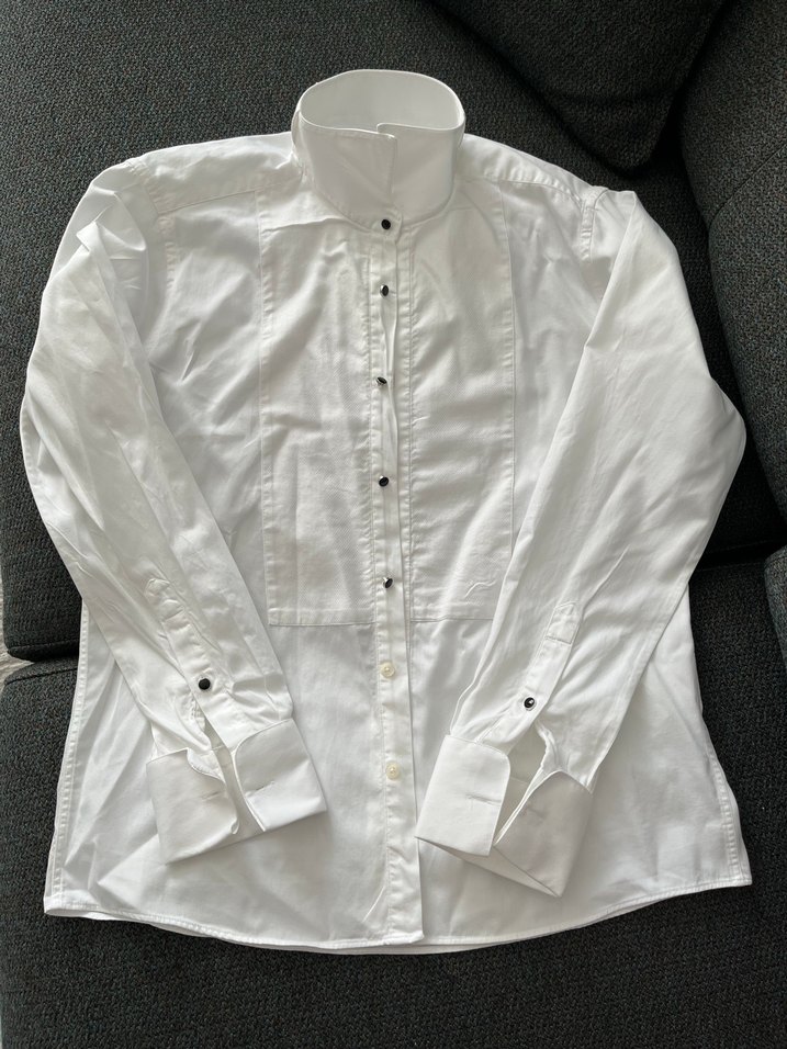 Beyaz gömlek , sadece papyon takmaya uygundur. Bedeni L. Sadece bir kez giyildi . Düğmeleri vs tamdır. Markası Altın Yıldız. Boyun kısmında gözükmeyen yerde ince ve göze çarpmayan leke vardır 4. Fotoğrafta gösterilmiştir. Dar kalıptır.