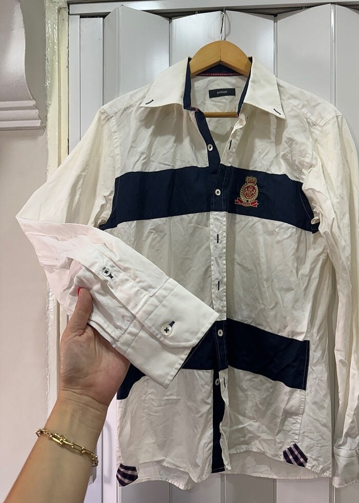Lacivert beyaz kalın şeritli Armalı gömlek sayılı giyildi regular fit