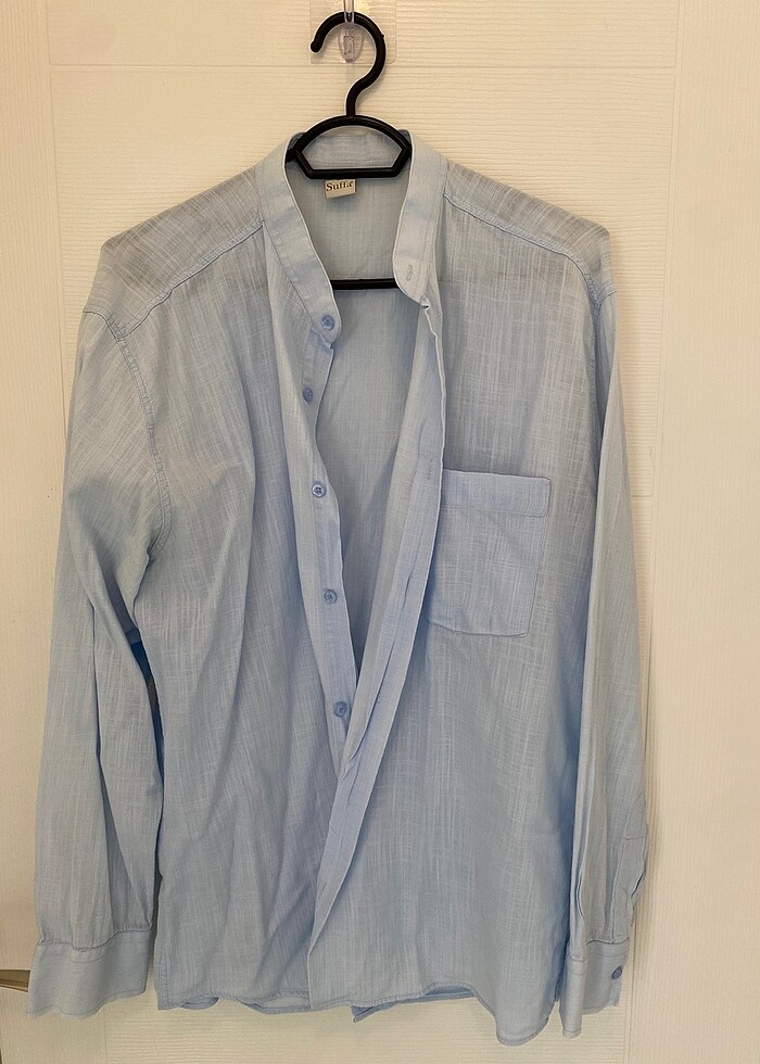Yazlık incecik hakim yaka erkek gömlek. L beden uyumlu. Tertemiz. Çok açık mavi tatlı bir rengi var.