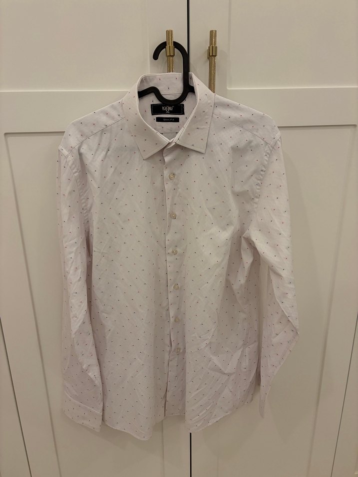 Pamuklu kumaştan yapılmış, yakalı ve düğmeli beyaz uzun kollu erkek gömleği. İnce baskılı deseni ve regular kesimiyle ofis için uygundur. Hiç bir kusuru ve sorunu yoktur 1-2 kez anca giyilmiştir.