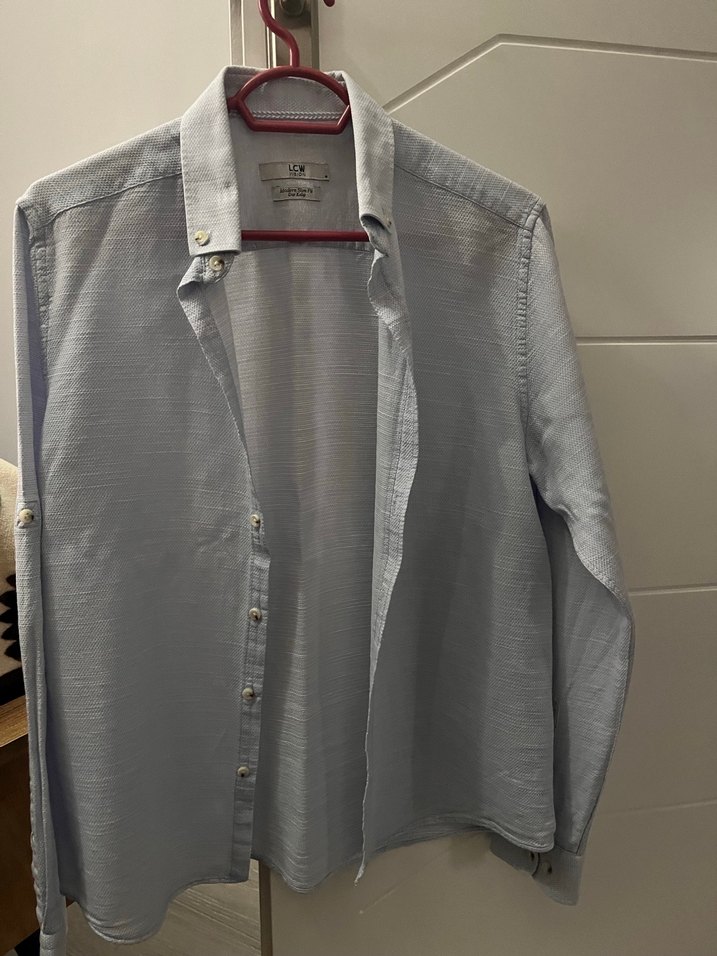 erkek gömlek, yakalı ve düğmeli uzun kollu ve normal boyda, günlük veya ofis kullanımı için uygun.