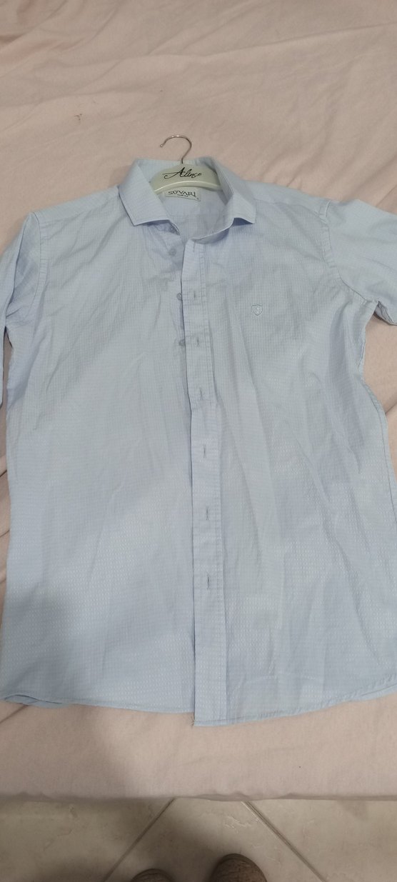 Pamuk kumaştan yapılmış, düğmeli ön ve , klasik yakalı erkek gömleği. Mavi-gri tonlarında, ofis ve günlük sokak stiline uygun.