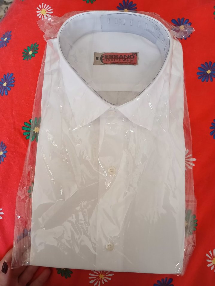 beyaz erkek gömleği, klasik yakalı ve düğmeli. Sentetik kumaştan üretilmiş, ofis için uygun, sade ve düz tasarımlı. hiç kullanılmadı yeni etiketli ürün.