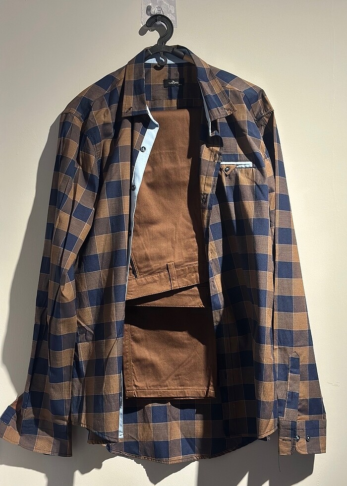 gömlek lacivert- taba rengi kareli tudors marka XXL beden. uzunluk: 82 cm genişlik: 57 cm pantolon taba rengi beden 36. boy: 99 cm bel: 45 cm paça genişlik: 19 cm kumaş:pamuk (65)- polyester (35