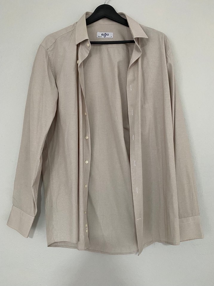 Bej keten erkek gömlek, kesik yakalı ve düğmeli. Uzun kollu, regular fit ve normal boyda, ofis ve günlük kullanım için uygun.