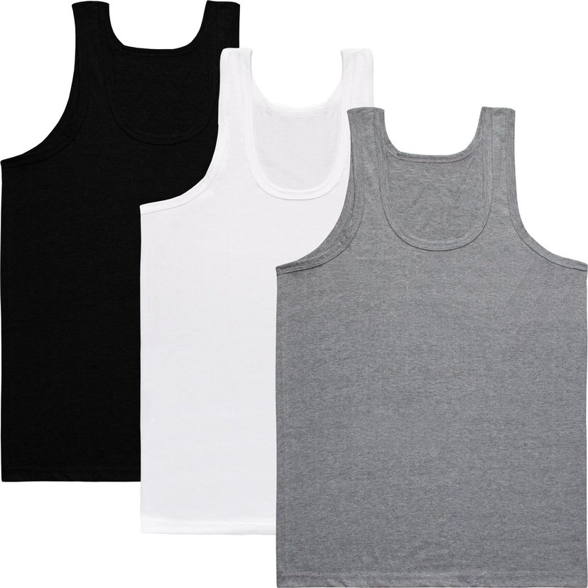 Gri, beyaz ve siyah renklerde, normal boyda ve vücuda oturan üçlü erkek atlet paketi. Desensiz ve atletik tarz için uygun. Tüm bedenler mevcuttur sıfır ürün