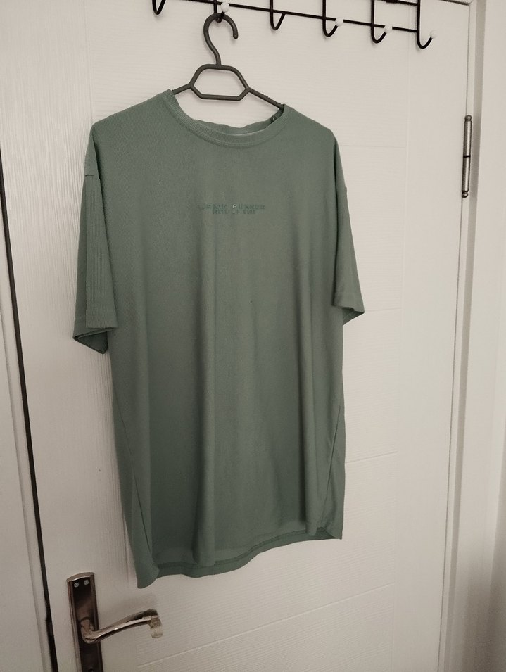 Erkek tişörtü, kısa kollu ve yuvarlak yaka olup bol kesimdir. Yumuşak sentetik kumaştan, gri-yeşil tonunda ve baskılıdır. Günlük rahat kullanım için uygundur.