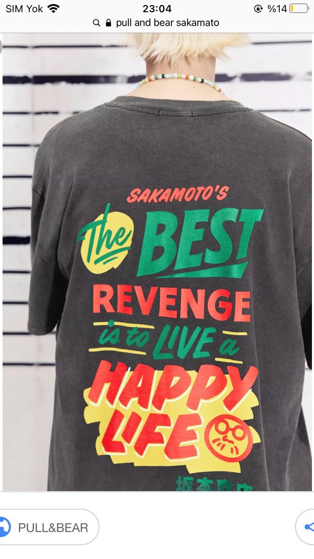 Erkek gri tişört, kısa kollu ve yuvarlak yaka ile rahat kesimdir. Sırtında renkli "The Best Revenge is to Live a Happy Life" baskısı bulunur. Kauçuk dokulu kumaştan üretilmiştir.