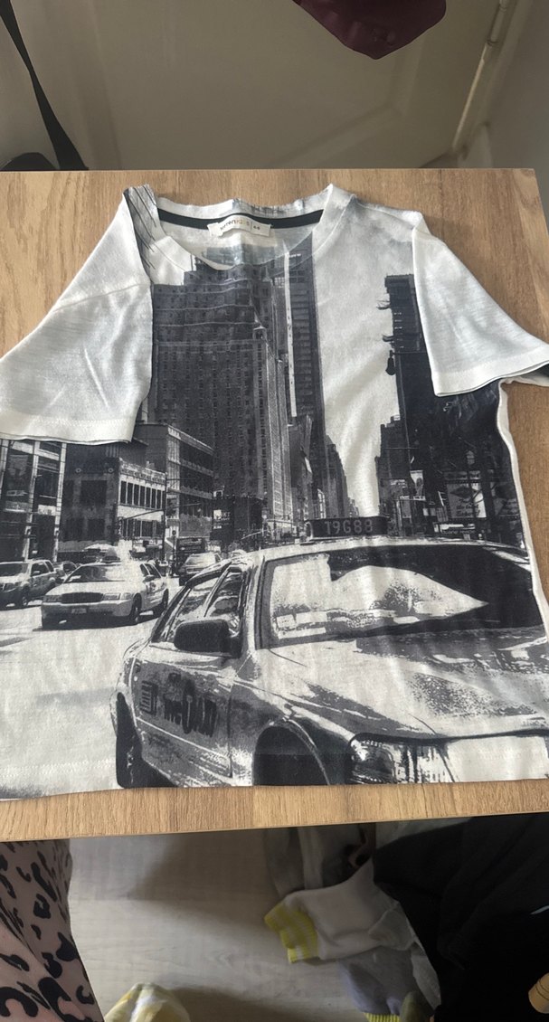 Gri sentetik kumaştan yapılmış, baskılı şehir manzarası desenli, kısa kollu ve yuvarlak yakalı bol kesim erkek tişörtü. Sokak stili için uygundur.