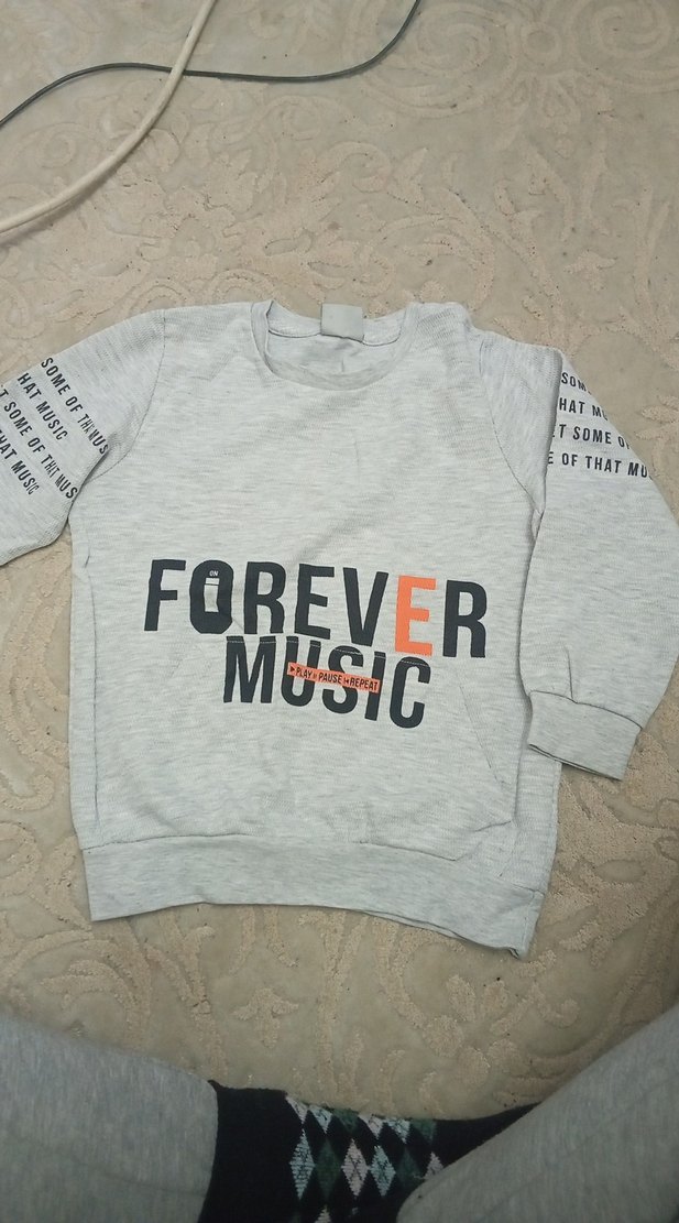 Gri renkli, uzun kollu ve yuvarlak yakalı erkek sweatshirtü. Örme yumuşak kumaştan, bol kesim ve baskılı 'FOREVER MUSIC' yazılı.