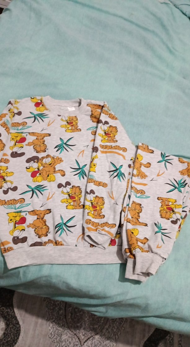 Erkek pijama takımı, gri renkli, baskılı desenli ve uzun kolludur. Rahat kesimi ve yuvarlak yakası 13 yaş etiketle ama 9- 10 yaş anca olur. pijamayı takımı internetten getirttim bedenini olmadığı için satıyorum küçük geldi sadece bir kere yıkadım kolunda dikiş özürü var fiyatı uygundu kargosu ile uğraşmamak için iade etmedim