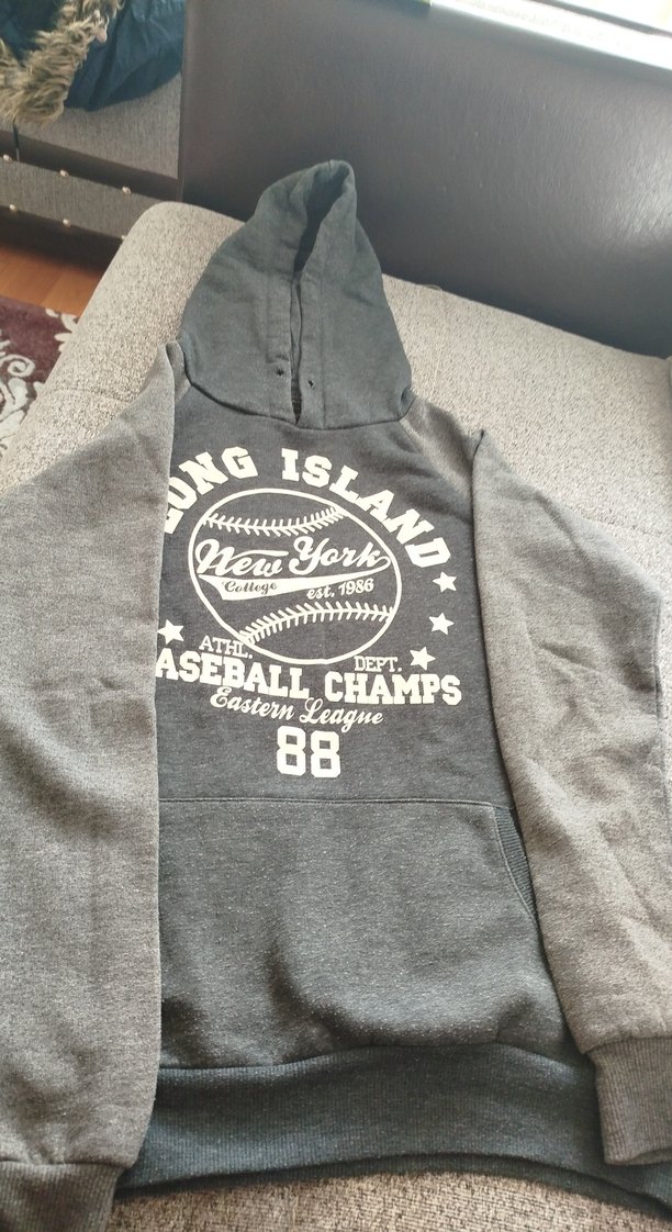 Bu gri erkek sweatshirtü, uzun kollu, bisiklet yaka ve bol kesimdir. Yumuşak ve sıcak kumaştan üretilmiş, baskili
