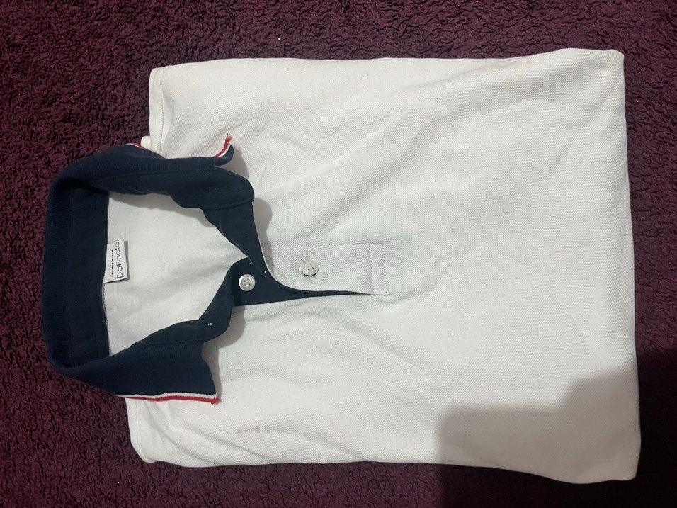 Beyaz renkte, gri detaylı erkek gömleği, düğmeli askı detayıyla. Yumuşak kumaş, sokak ve spor tarzına uygun.