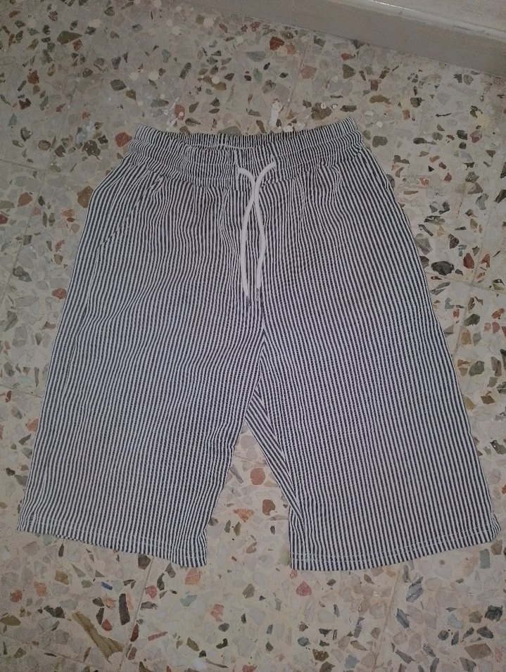 Gri beyaz çizgili, pamuklu, bol kesim erkek şort. Pilili detaylar ve ayarlanabilir bağcıklı bel bandı ile rahatlık Ürün sıfırdır.