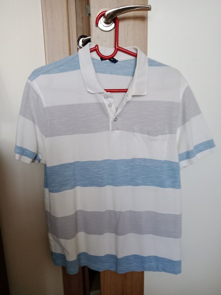 Pamuklu, rahat kesim erkek polo tişört, kısa kollu ve düğmeli yakalı. Beyaz zemin üzerinde geniş gri ve mavi yatay çizgiler bulunur.