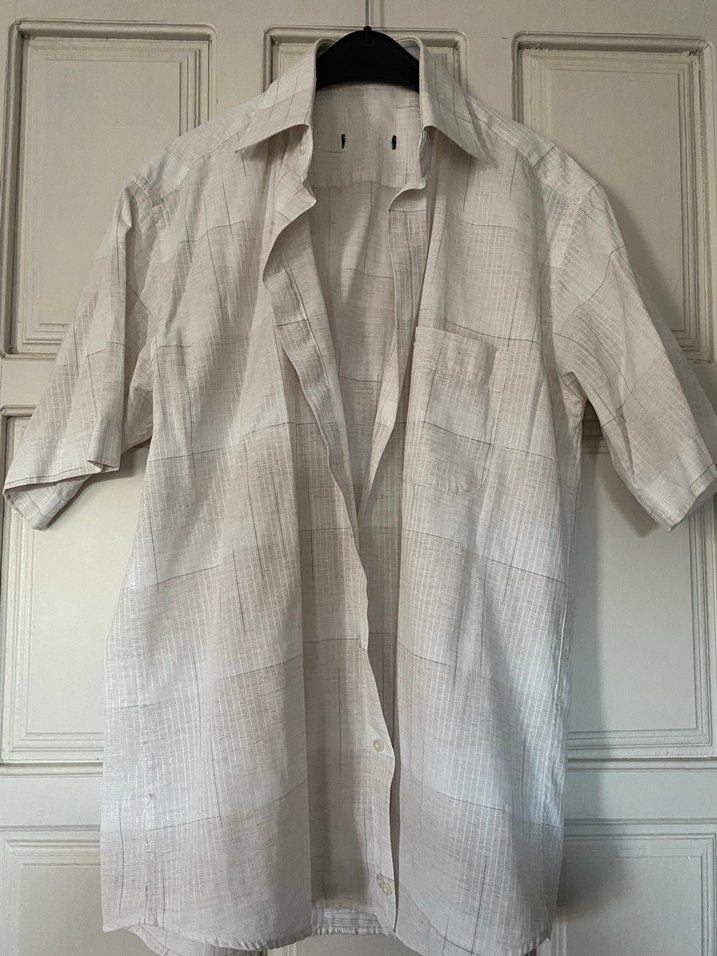 Erkekler için keten kumaştan, kısa kollu, düğmeli ve yakalı gömlek. Beyaz zemin üzerine gri desenli, rahat kesim, günlük sokak stiline uygun.