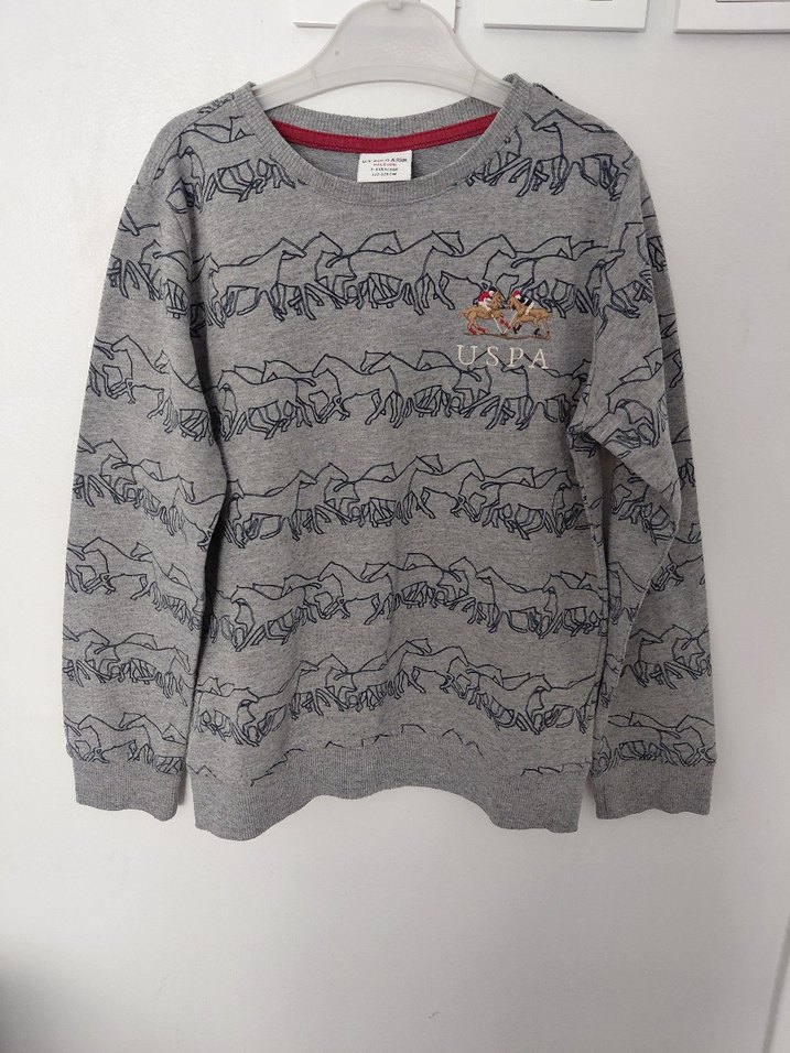 Erkekler için uzun kollu, bisiklet yaka, bol kesim gri sweatshirt. Yumuşak örme kumaş, at desenli baskı ve USPA logosu ile sokak tarzına uygun.